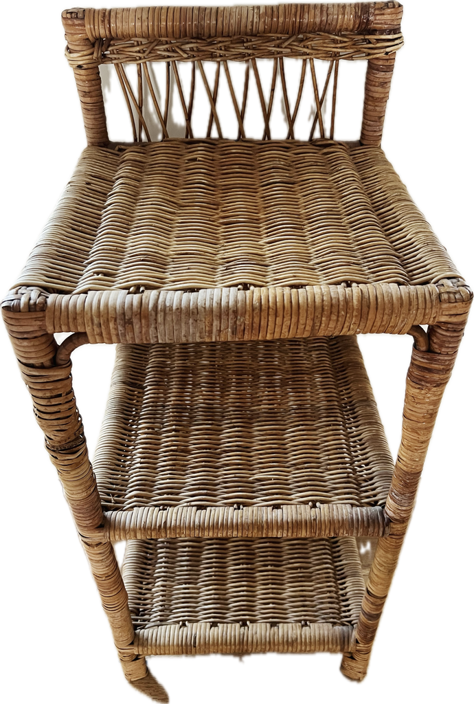 Add a touch of vintage charm to your home with this wicker rattan triple tiered shelf/end table. With three shelves, this square-shaped unit is perfect for displaying books/magazines, decorative items or mail/car keys. The shelf can be wall-mounted or free-standing. Crafted from high-quality rattan and wicker materials, this shelf is both durable and stylish. The solid pattern and mid-century style make it a great addition to any room, including an entryway or bathroom