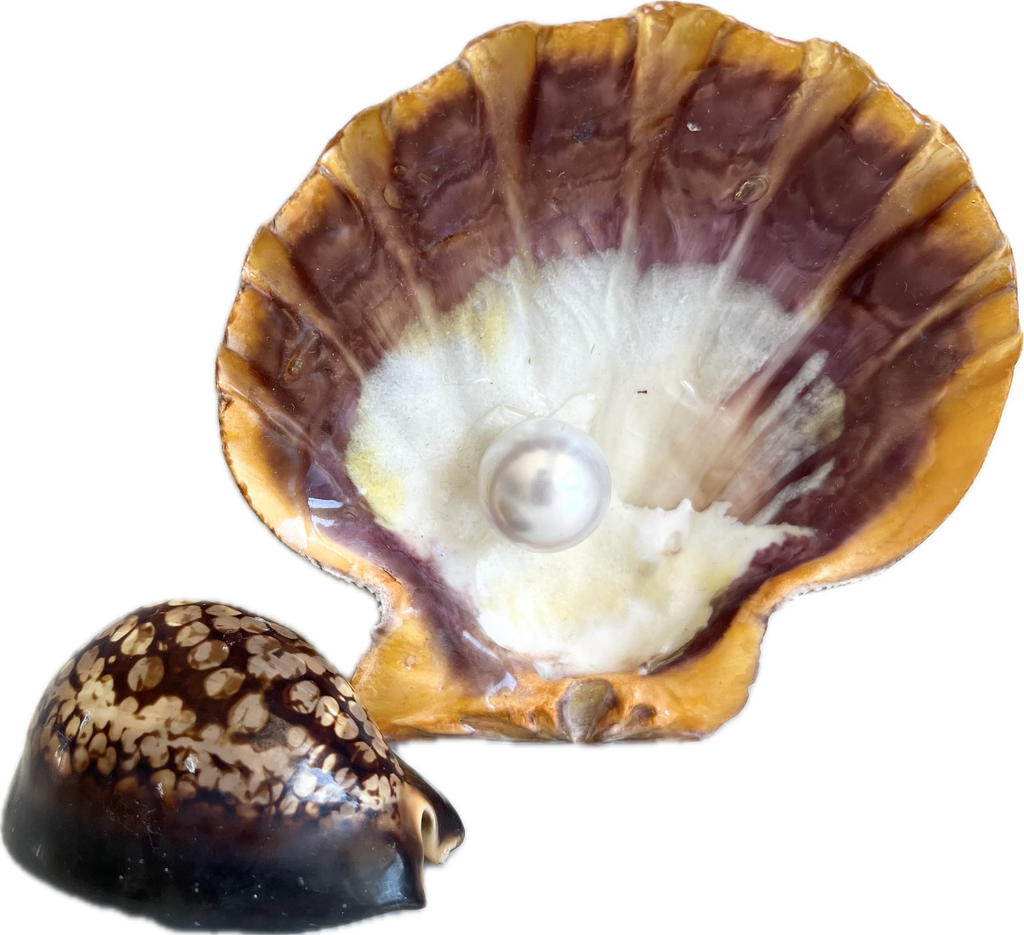 Magnificent clam shell with coated pearl on display. This pair includes both shells. Pearls are the only gemstones created by a living creature. Pearls are also the birthstone for June.