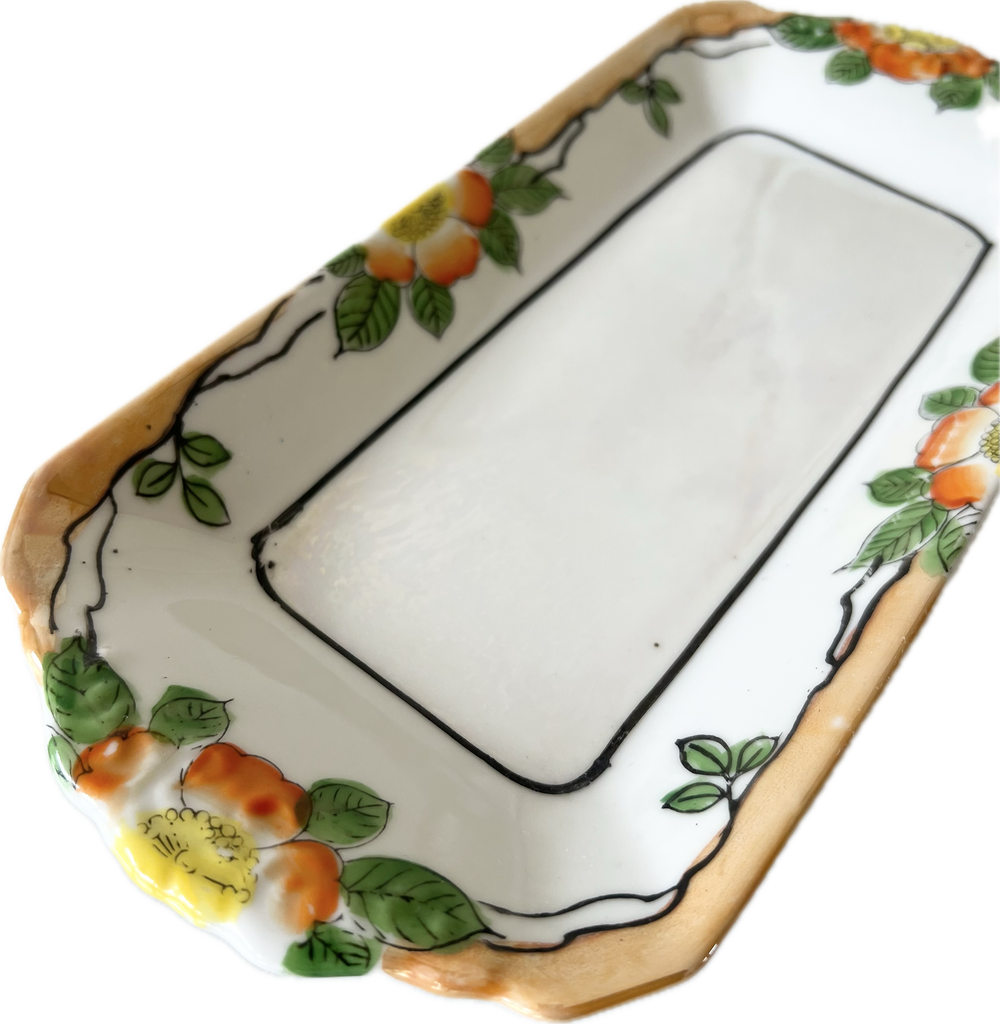 Antique hand-Painted porcelain serving dish most likely made in Japan. The colors are bright and vivid. This gorgeous dish features a floral orange and green design and can also be considered a celery/snack tray, candy dish or vanity piece.