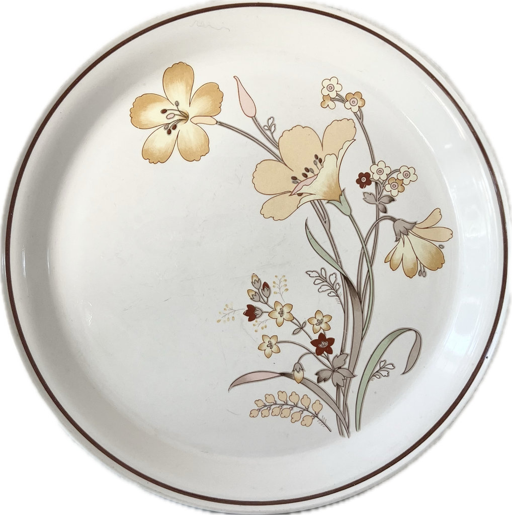 Floral stoneware chop plate manufactured by Nitto Heather Stone Dansant. Features a soft floral pattern with yellow and brown flowers, characteristic of 1970s dinnerware.