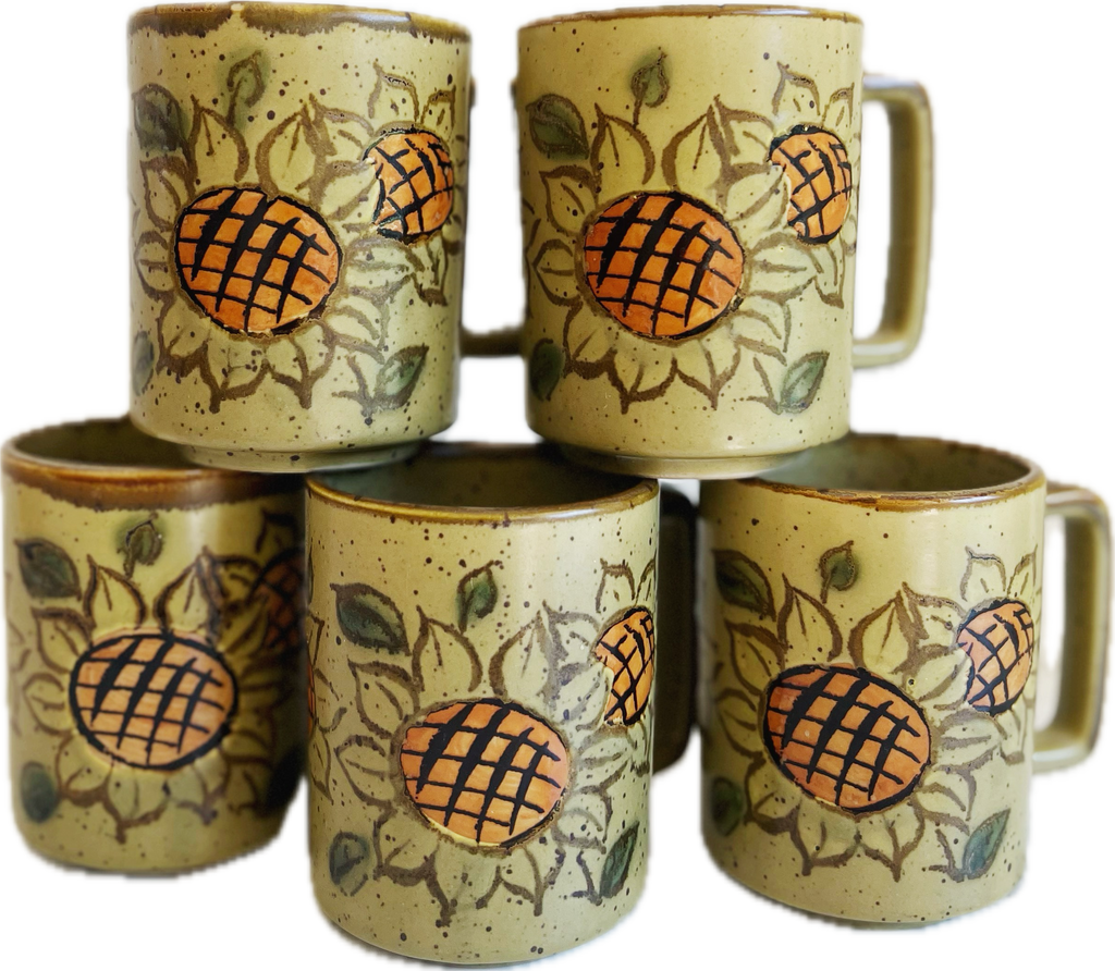 Crafted from speckled stoneware with a glaze finish, this 1970’s vintage stoneware mug set, possibly made by Otagiri features a sunflower design in earthy tones of brown, orange, and green. The set includes five mugs.