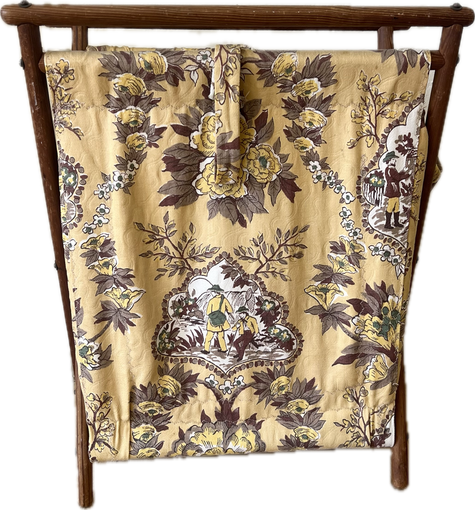This wooden folding frame sewing basket, yarn caddy holder features a classic floral pattern with illustrative figures in a pastoral setting. This type of basket typically features a wooden folding frame and a fabric bag for storage. These caddy’s are designed to hold craft supplies like yarn, needles, or sewing notions. These baskets are often collectible items, particularly those with unique fabrics or in good condition. Ideal to store books and/or magazines.