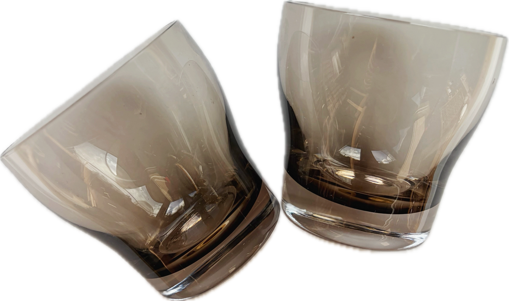 1960’s Vintage Libbey smokey gray heavy bottomed double old fashioned glasses. These bar tumblers have a thick glass base. Listing includes pair of tumbler glasses.