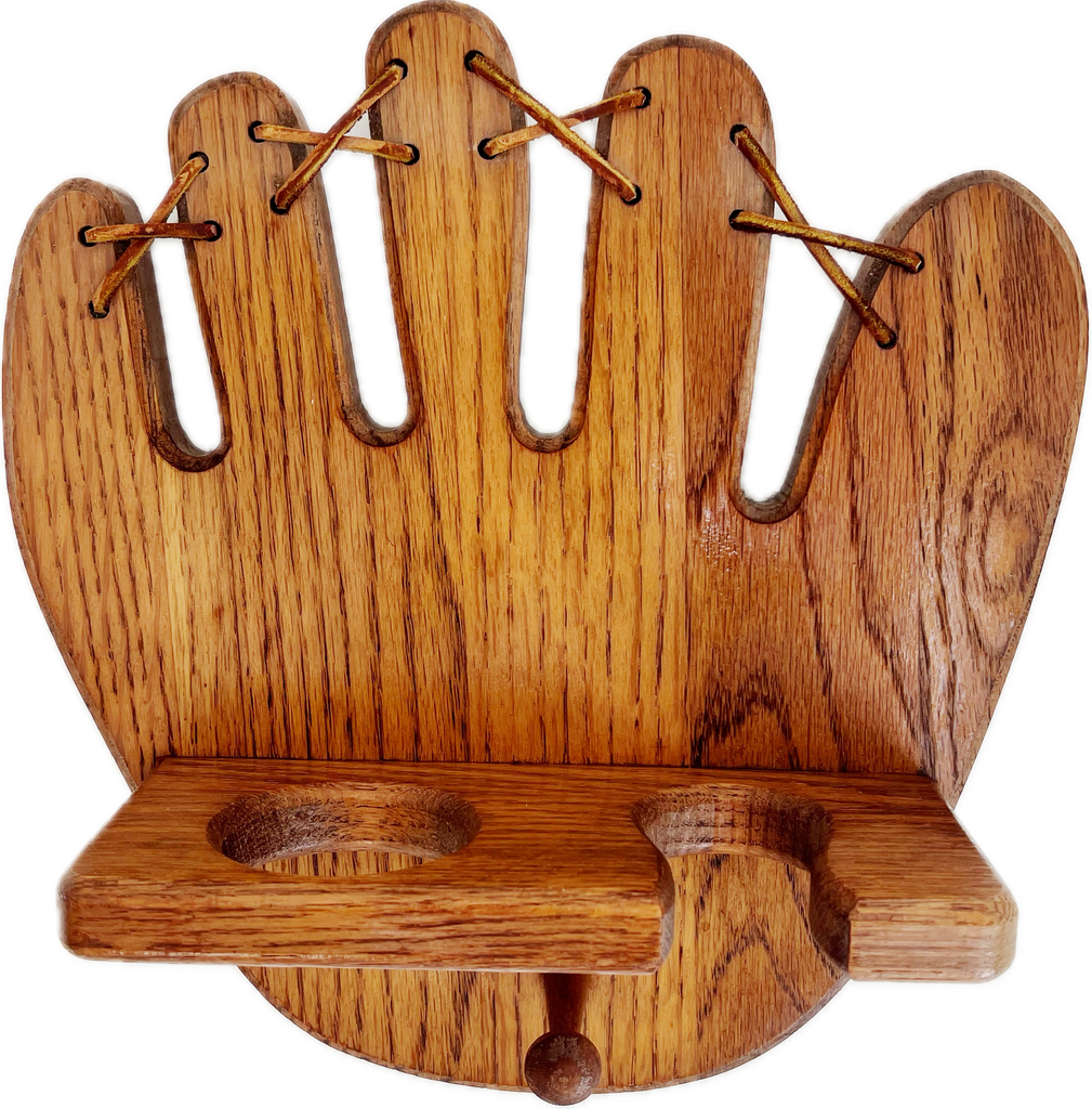 Hand crafted oak wood baseball glove wall mount/shelf most likely from the 1970’s. This vintage sports shelf features one peg to hang a hat or glove and two inserts for a ball and bat. This vintage display item makes great wall art adding a bit of old charm to your player’s space.