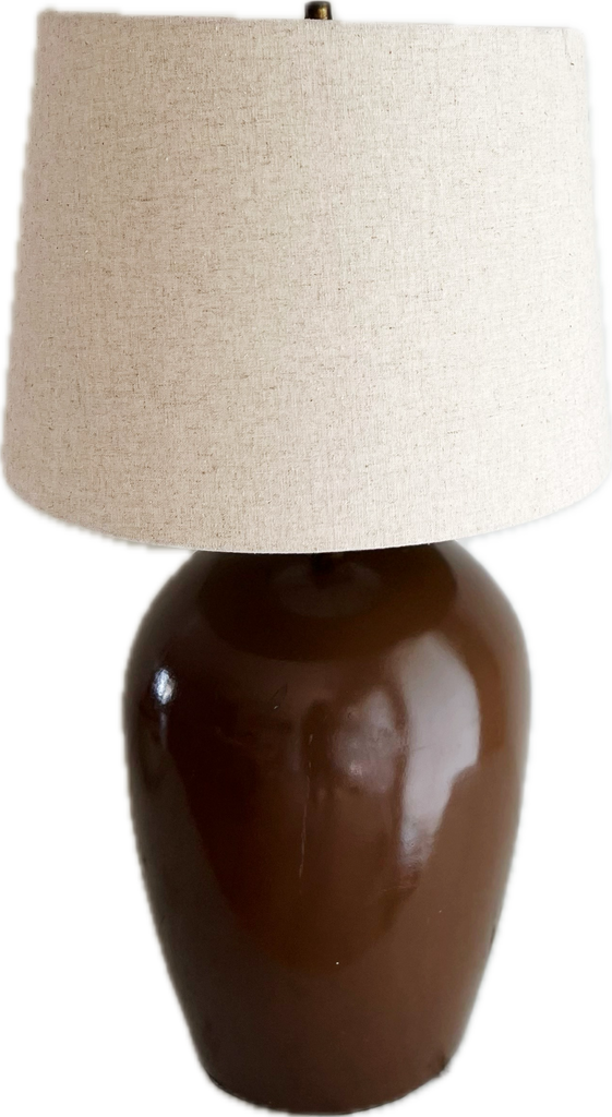 This handsome 1995 brown wide urn barrel table lamp offers a rustic look. Includes modern flax linen ivory lamp shade.