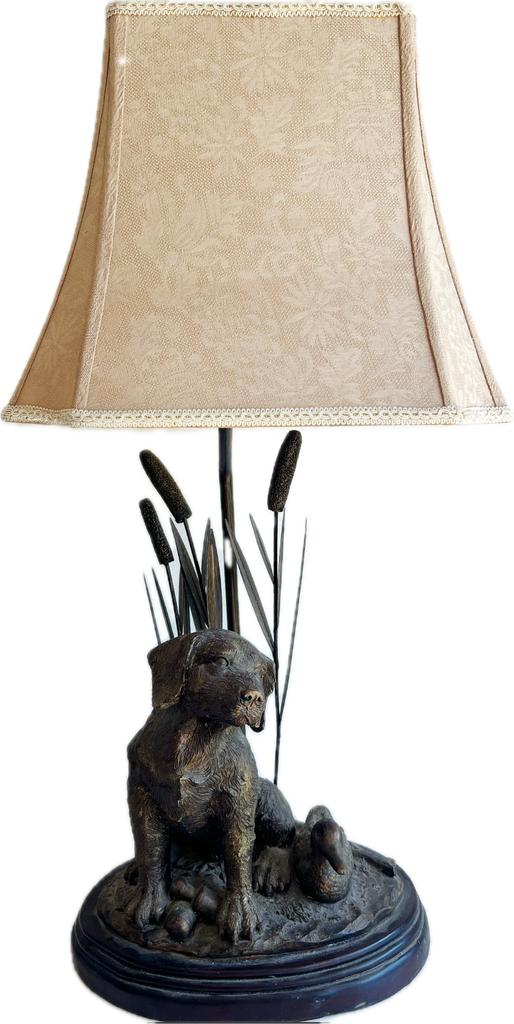 Antique Bronze Labrador with Duck and Cattails Table Lamp won’t last long! Enjoy the wildlife artistry of a labrador retriever sitting in the water next to the cattails with his retrieved mallard. Perfect rustic decorating idea for the cabin by the lake.