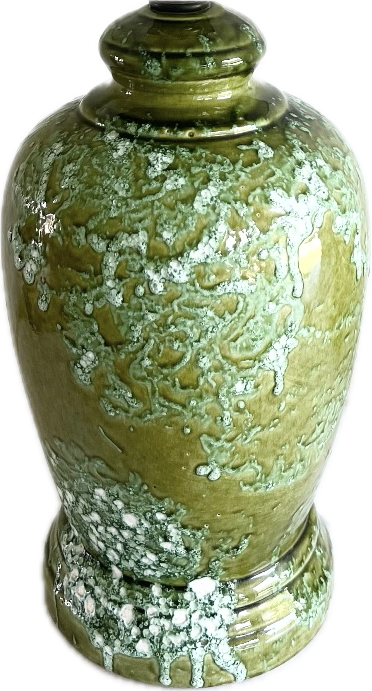 This vibrant lamp features a unique pottery; what's called a "tire glaze" - a technique that shapes the mottled green glaze porcelain. The style is Mid-Century and the marbelized glaze gives off an old, but also modern mood. It's surely a statement piece to add to a space.