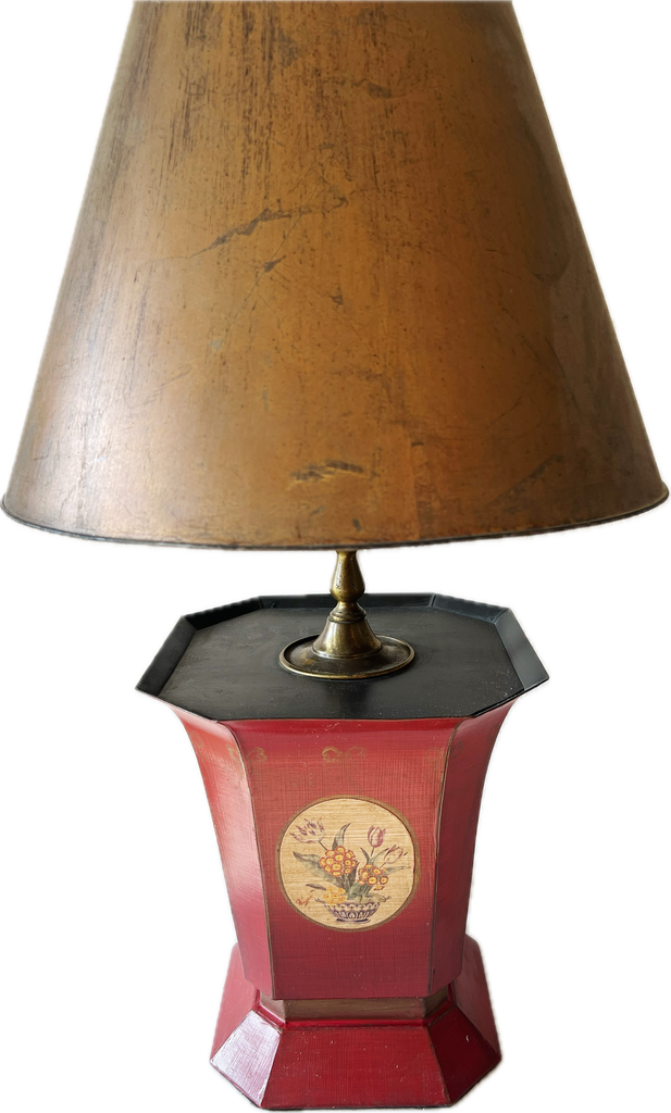 This item is extremely rare! Antique red ornate Tole tea table lamp with a hand-painted floral motif. Electrical lamp features a gorgeous brass colored tin shade. Style is neoclassical and this is a unique find that will dress up any surface.