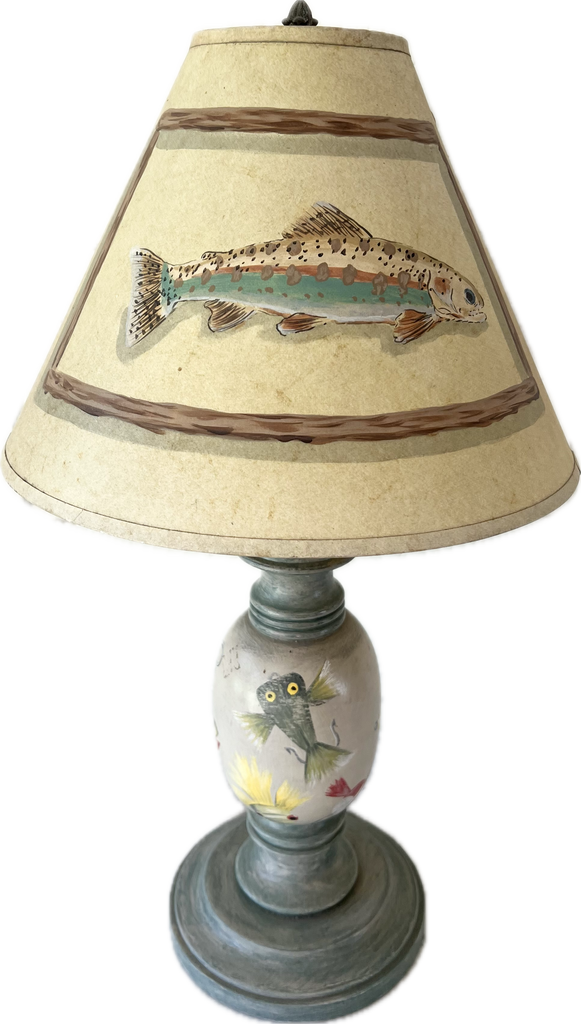 Rare fisherman’s dream piece! Rustic fishing/nautical themed decor lamp features a painted rainbow trout on one side of the parchment lampshade, a larger fish on the other side and smaller fish motifs on the resin hand-painted base. This antique item could be referred to as a “fish lamp” or “cabin lamp.”