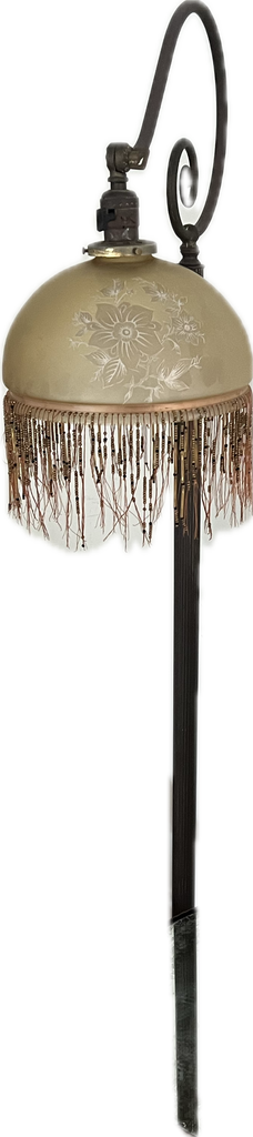 This unique 1920’s Victorian style vintage beaded fringe brass floor lamp features a curved arm, often referred to as a gooseneck or bridge arm, extending from the stand to support the lampshade. Another distinctive feature is the lampshade adorned with a beaded fringe, which is made of yellow glass. The shade also has an etched floral pattern. These lamps often exhibit design elements popular in earlier eras, such as Art Deco or Victorian styles, and can be made of materials like brass or bronze.