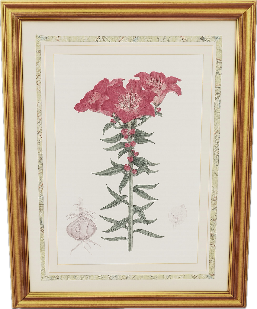 The image is a framed botanical illustration of an orange lily (Lilium bulbiferum) print in an ornate gold frame. This species is a European wildflower known for its upright, bright yellow-orange flowers with reddish-brown dots. It is named for the small black bulbils (tiny bulbs) that it produces along its stem, which are visible in the illustration.