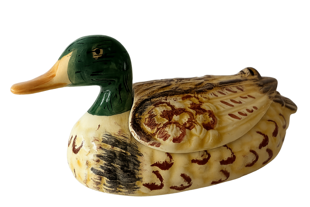 This rare two-piece item is a hand-made and hand-painted ceramic mallard duck trinket box that opens and can be used as a jewelry dish or trinket holder.