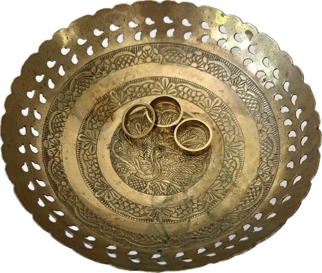 This piece is exquisite; an harmonious blend of form and function! Gorgeous detailed decorative solid brass bowl featuring a peacock design etched into the heart of the piece. More than just a functional item, this bowl serves as a stunning decorative accent, radiating warmth and sophistication. Its’ golden hue and intricate detailing will effortlessly enhance any space. The rim is finished with a cut-out design, adding a touch of whimsy and lightness to the overall aesthetic. We will have a hard time letting this one go!
