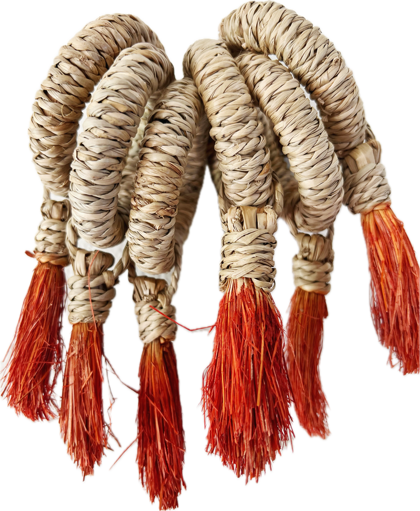 Sold as a set of 6. These decorative woven napkin holders are crafted from natural fibers - raffia and natural straw. The holders feature a vibrant red tassel that gives the table a rustic, bohemian, or natural aesthetic. These would complete any table with a coastal/farmhouse-style gathering theme.