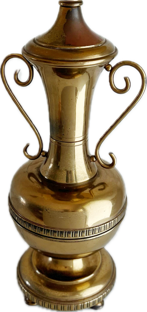 This elegant and striking vintage brass table lamp brings timeless sophistication to any room. Its’ era is Mid-century to late 20th century. Crafted in a classic urn form with gracefully curved side handles, it features intricate detailing around the base and sits on small raised feet for an elevated look. A wonderful statement lamp curated for a refined or eclectic interior — pairs well with antique furnishings, traditional décor, or as a bold contrast in modern spaces. Lamp shade photographed is not included with listing.