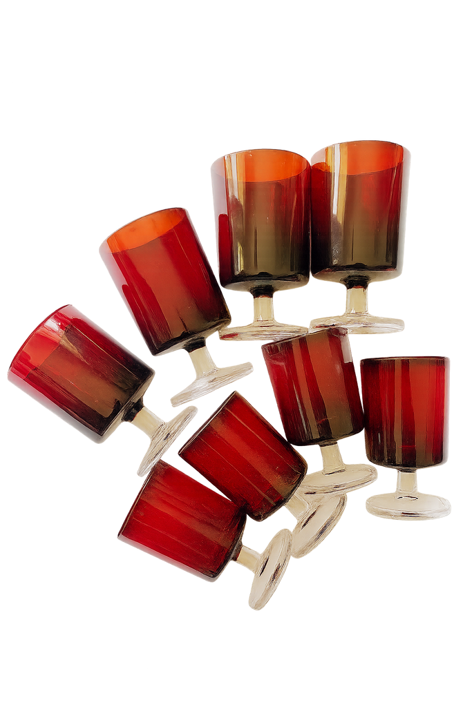These vintage ruby red coupe wine glasses were made in France in the later mid-century. The glasses have a modern shape with a transparent glass stem and base. The red reflects light beautifully and is a standout on any tablescape. These are versatile and sturdy - perfect for water, wine or cocktails. Authenticity identification is stamped 'France' on the bottom of each glass. Listing is for 8 glasses (4 6-8oz glasses and 4 4-6oz glasses).