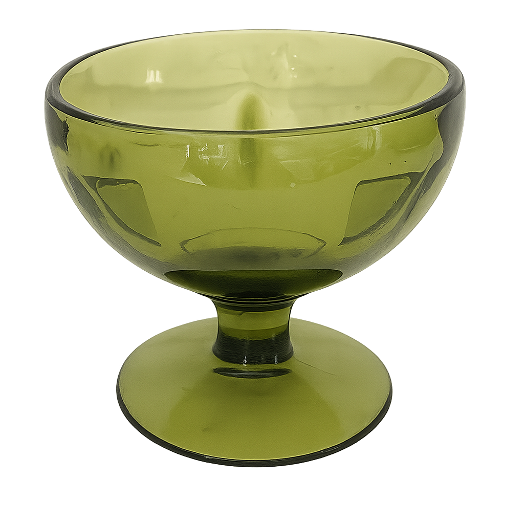 This vintage 1960’s Indiana Glass olive green pedestal bowl is a decorative collectible. It can be used as a trinket bowl, candy dish, candle holder or for adding a touch of retro style.