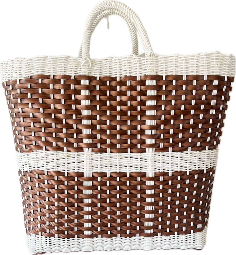 Hand-woven from recycled plastics this bag can go everywhere. Big enough to hold towels and water bottles for the beach or stylish and fun to dress up. Brand unknown.